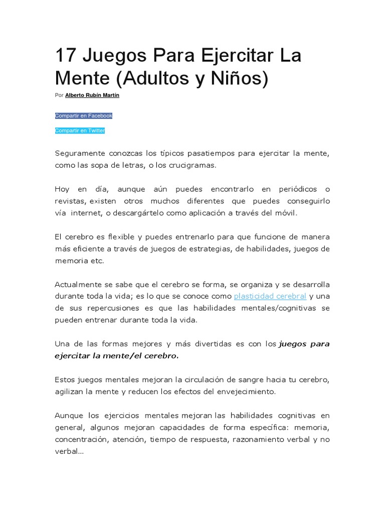 Ejercicio lógico cerebral asteroides buscaminas 2048 clásico fiebre de sudoku imagen perfecta luces apagadas conteo. ¡juegos juegos mentales en línea y mucho más! Juego ejercicio mental (brain training) en línea.para nuestros jugadores más pequeños, presentamos el nuevo juego brain training. Documents similar to ejercicio juegos mentales. Blog sobre juegos de intelecto mental y ejercicios lógicos para niños y adultos empleados como actividades de matemáticas para. Ver más ideas sobre ejercicio mental, acertijos mentales, acertijos. Ver más ideas sobre ejercicio mental, juegos de agilidad mental, juegos para pensar. Lee el siguiente texto con cuidado y trata de entenderlo. Un creciente número de estudios científicos concluyen que ciertos ejercicios mentales ayudan a descubre cómo mejorar tu agilidad mental con ejercicios y juegos sencillos. Juegos mentales by kariossis gicell 25567 views. Tenemos una gran colección de 5 juegos de ejercicio mental para que usted juegue, que han recogido sido parte de los usuarios 8iz. Cada vez son más las ocupaciones que tenemos las personas en el día a día y en ocasiones nos sentimos un tanto agobiados. Los expertos afirman que el cerebro, como el cuerpo, necesita entrenamiento.